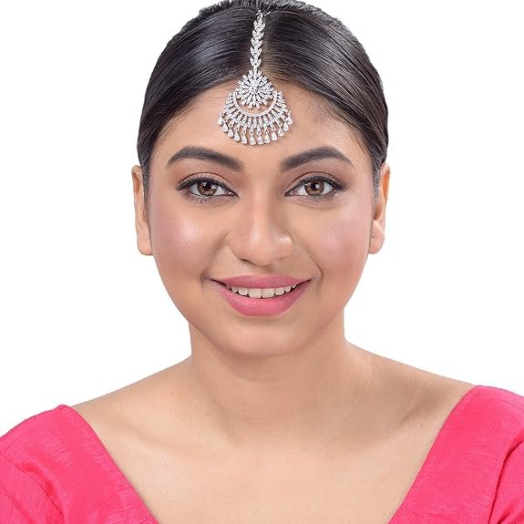 Add a royal flair to your look with this Beautiful Chandbali Style Maang Tikka, elegantly AD (American Diamond) studded for a sparkling finish. Inspired by classic Mughal designs, this statement piece is perfect for weddings, sangeet, and festive celebrations.