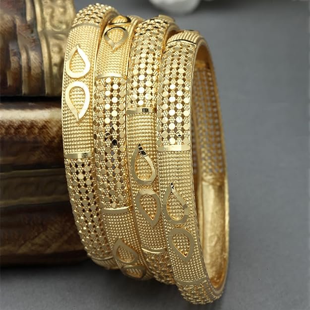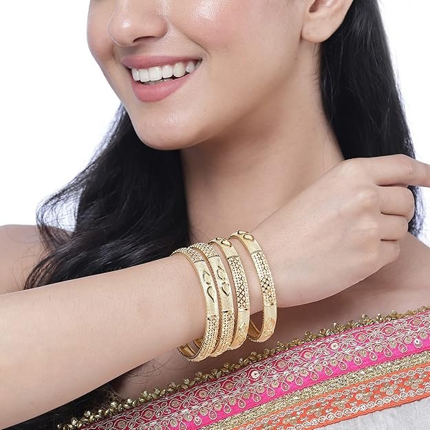 - What You Get:- Set Of 4 Gold-Plated Classic Paisley Shaped Textured Handcrafted Bangles, secured with Slip-On closure.